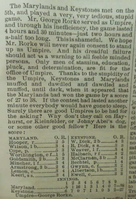 While the writer of this July 5, 1869 game recap does not call for robots, after ranting about "the stupidity of the Umpire", he suggests a dog be hired for the next game.