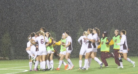 The Central Michigan soccer team celebrates a double overtime win against Miami (Oh) on Friday, Sept. 30.