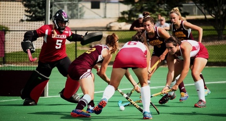 Indiana University Bloomington and CMU field hockey teams grapple for an upper hand on their opponents near Indiana University's goal.