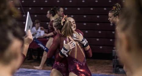 Senior Megan Lamphere and sophomore Bryttany Kaplan hug during the meet against Kent State at McGurk Arena, Sunday, Feb. 28, 2016.