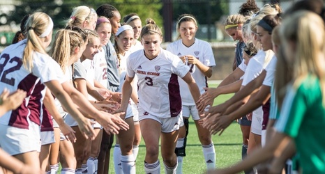 Sophomore forward Alexis Pelafas slaps the hands of her teammates as she is introduced before the game against Youngstown State at the CMU Soccer/Lacrosse Complex, Friday, Aug. 26, 2016.