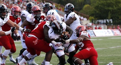 The game began with a fast-paced Cincinnati drive. Facing 3rd and 4, Gunner Kiel throw a pass into a crossing Shaq Washington. Washington took a hit to the head, stood up - clearly dazed - and then fell to the turf. He was immediately taken to the locker room. Cincinnati converted the fourth down and Mike Boone ran the ball in from four yards out shortly after.