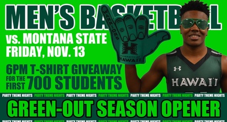 Giveaways: Free green T-shirts to the first 700 UH students; free spirit flags to the first 1,000 fans through the turnstiles, courtesy of Outrigger Resorts; fans can sign up for a chance to compete in the “Shoot for Loot” contest at halftime that will award up to $2,000.