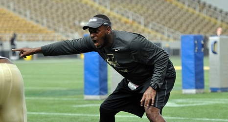 Idaho defensive line coach Kenny Holmes speaks with media members following a practice August 25 at the Kibbie Dome.