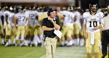 Idaho head coach Paul Petrino speaks with media members following his team’s scrimmage August 20 at the Kibbie Dome.