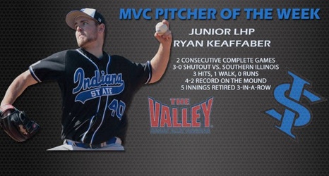 ST. LOUIS, Mo. -- The Missouri Valley Conference office has announced junior lefty, Ryan Keaffaber, as the MVC Pitcher of the Week. The Wabash, Ind., native improved to 4-2 behind two consecutive complete game starts, as he holds the only complete games for the Indiana State pitching staff so far this season. Keaffaber becomes the third Sycamore to earn this weekly honor, as junior Justin Hill and senior Daniel Peterson have earned the honors previously this season.