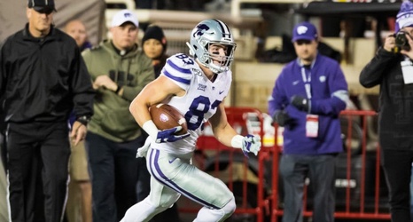 LUBBOCK, TEXAS - NOVEMBER 23: Wide receiver Dalton Schoen #83 of the Kansas State Wildcats runs with the ball during the first half of the college football game against the Texas Tech Red Raiders on November 23, 2019 at Jones AT&T Stadium in Lubbock, Texas. (Photo by John E. Moore III/Getty Images)
