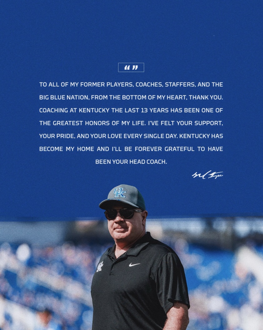 “To all of my former players, coaches, staffers, and the Big Blue Nation, from the bottom of my heart, thank you,” Stoops said in a message on social media. “Coaching at Kentucky the last 13 years has been one of the greatest honors of my life. I’ve felt your support, your pride, and your love every single day. Kentucky has become my home and I’ll be forever grateful to have been your head coach.”