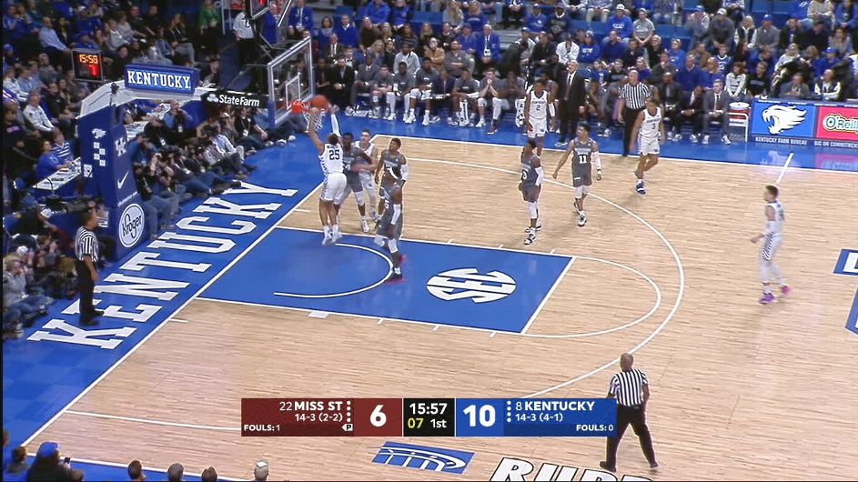 After a somewhat sloppy start, the freshman wing took advantage of a Mississippi State mistake. Johnson sprinted the length of the floor before taking flight.
