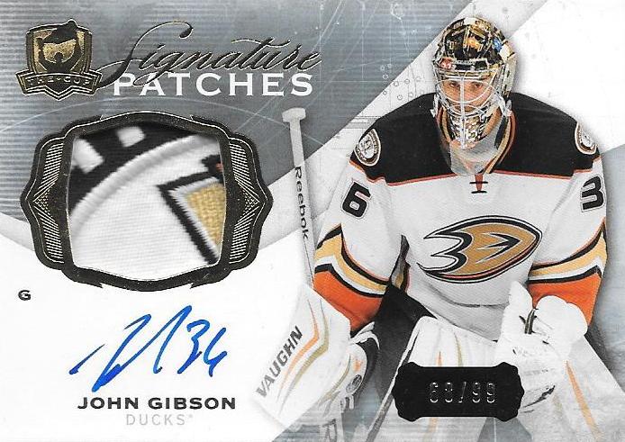 Numbered 68/99, it features an on-card auto and a phenomenal 4-color logo patch from the shoulder of an Anaheim Ducks' sweater, similar to what you see on Gibby's right shoulder in the photo Upper Deck used.