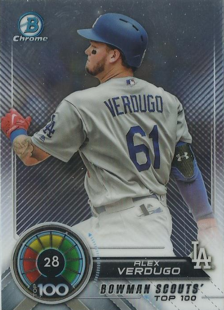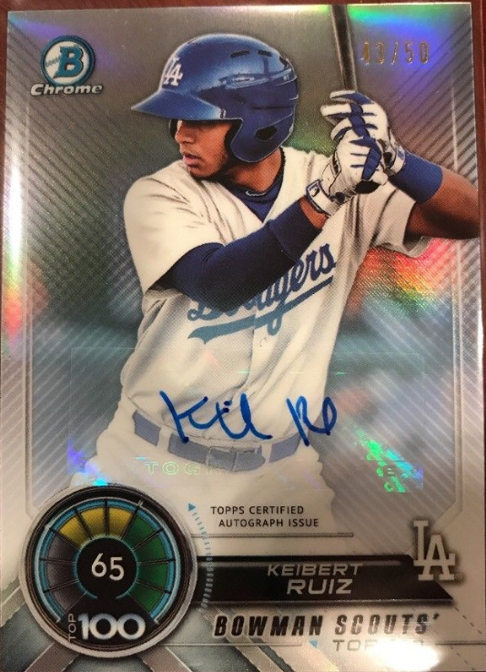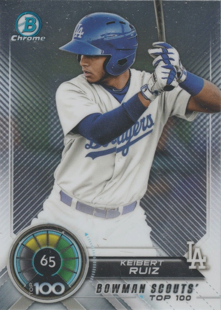Here's a final look at the Dodgers' cards found in packs of 2018 Bowman Baseball. This time we take a peek at the Bowman Scouts Top 100 insert set, #BowmanTrending, Sterling Continuity, ROY Favorites and the Talent Pipeline cards.