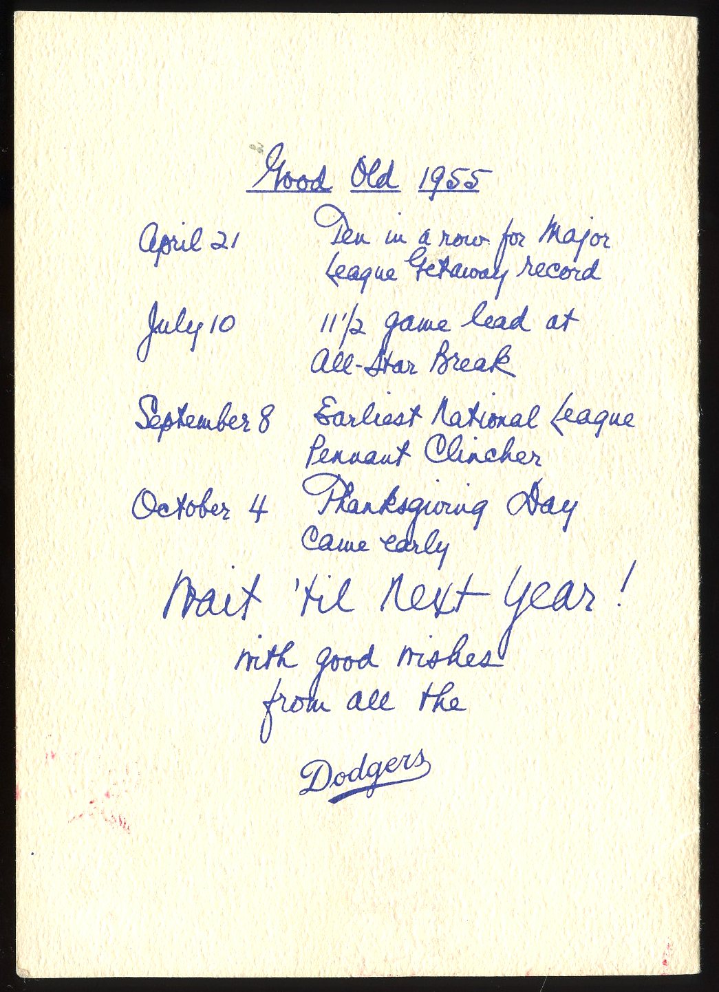 Since the holidays are just around the corner I though the above 1955 Dodgers Christmas card would be fun to point out. (Auction Link) As you know, this year was the franchises first championship, so naturally their Christmas card had to reflect that.