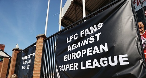 Liverpool supporters have hung banners outside Anfield protesting plans for a European Super League, with one reading 'Shame on you. RIP LFC 1892-2021.'