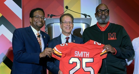 University of Maryland president Dr. Darryll Pines, left, athletic director Jim Smith, center and football coach Michael Locksley, right pose at Smith's introductory news conference. Smith said Wednesday he's confident in Locksley to lead the team's football team despite three losses in a row. (Kim Hairston/Staff)