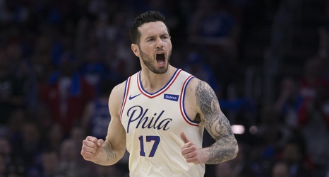 PHILADELPHIA, PA - APRIL 24: JJ Redick #17 of the Philadelphia 76ers gets fouled by Tyler Johnson #8 of the Miami Heat at Wells Fargo Center on April 24, 2018 in Philadelphia, Pennsylvania. (Photo by Drew Hallowell/Getty Images)