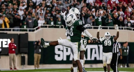 Michigan State's Kalon Gervin (18) celebrates safety Michael Dowell's touchdown on the final play of the 40-31 win against Indiana at Spartan Stadium in East Lansing, Saturday, Sept. 28, 2019. Michigan State celebrates, Kalon Gervin