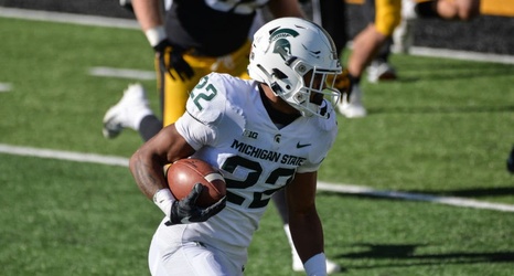 Nov 7, 2020; Iowa City, Iowa, USA; Michigan State Spartans running back Jordon Simmons (22) runs the ball against the Iowa Hawkeyes during the third quarter at Kinnick Stadium. Mandatory Credit: Jeffrey Becker-USA TODAY Sports