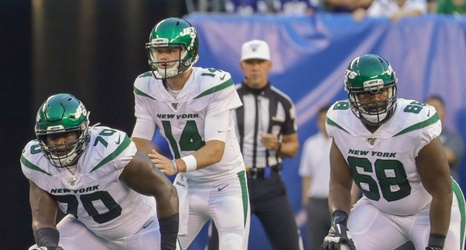 Jets quarterback Sam Darnold #14 calls the signals while offensive guard Kelechi Osemele #70 and offensive tackle Kelvin Beachum #68 look over the defense during the first quarter of a preseason game at MetLife Stadium in East Rutherford NJ on Aug. 8, 2019. Photo Credit: Daniel De Mato