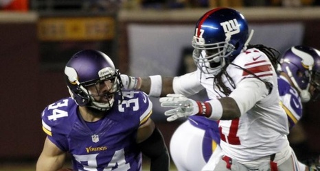 Adrian Peterson ran for 104 yards and a touchdown before resting in the fourth quarter, Harrison Smith took one of Eli Manning's three interceptions into the end zone and the Vikings qualified for the playoffs with a 49-17 victory over the listless New York Giants on a frigid Sunday night.