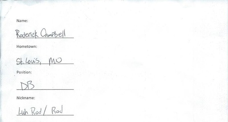 Welcome to Meet the (Blanking) Freshmen. You might know where they’re from or what position they play, but do you really know them? We decided to give these freshmen the first of many tests during their time at Northwestern, and we’ll hope to release a handful every week. Unlike in college, however, these tests aren’t graded—at least not by us. We finish up the Week 1 bunch with Roderick Campbell. Yes, this is his real handwriting.