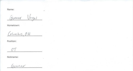 Welcome to Meet the (Blanking) Freshmen. You might know where they’re from or what position they play, but do you really know them? We decided to give these freshmen the first of many tests during their time at Northwestern, and we’ll hope to release a handful every week. Unlike in college, however, these tests aren’t graded—at least not by us. After a couple of weeks off, we roll on with OL Gunnar Vogel. Yes, this is his real handwriting.