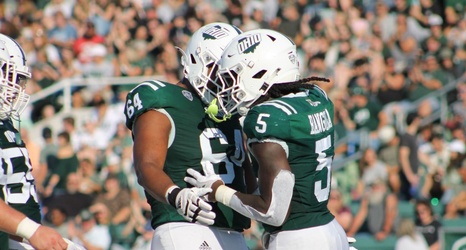 Ohio running back Sieh Bangura (5) celebrates with Shedrick Rhoades Jr. -