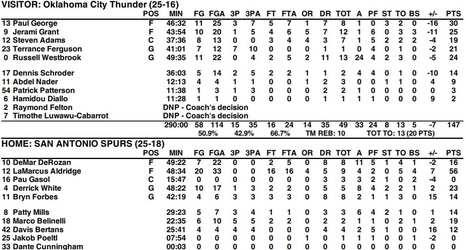 The Oklahoma City Thunder (25-16) dropped their third straight on Thursday night in San Antonio, falling to the Spurs (24-19) in double-overtime by a final score of 154-147. Despite Russell Westbrook’s 24 points, 24 assists, and 13 rebounds — and 119 points from the Thunder starting lineup — LaMarcus Aldridge exploded for a career-high 56 points and the Spurs hit 16-of-19 from long range to take the victory.