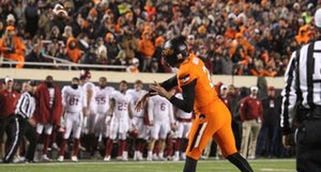 Mason Rudolph throws a pass, which was intercepted, during Bedlam on Nov. 28 at Boone Pickens Stadium.
