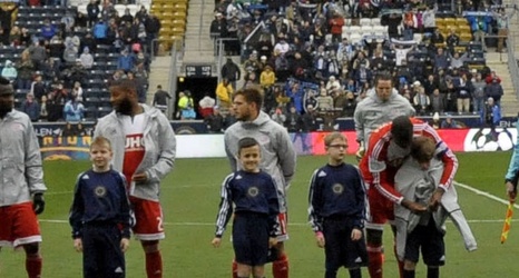 The main image of this article is of two New England Revolution players giving up their warmup jackets to two player escorts who came out with them. Jose Goncalves and Je-Vaughn Watson would have made these kids' day just by standing there and humming along while the national anthem was being sung, but they noticed the kids were cold and shivering and gave up their jackets for them.