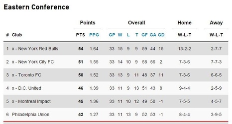 The order of Major League Soccer tiebreakers for teams that end up with the same number of points is first, number of wins, and second, goal differential. The only way the Union are not playing a playoff game either October 26th or 27th is if they lose to New York Red Bulls, New England defeats Montreal Impact, and the goal differential in those two matches would have to be at least 13.