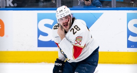 He immediately dropped to the ground for an instant before getting up, blood streaming down his face, and skating to the locker room, as a trainer held a towel to JM's face.