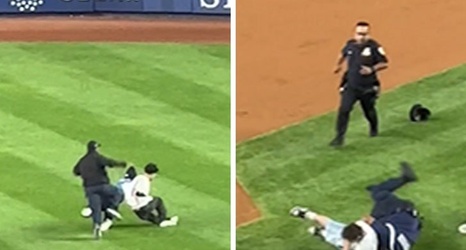The first fan, who seems to be holding an Aaron Judge jersey, rushed the outfield ... only to get leveled by a security guard who charged all the way from first base.