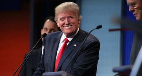 [A helicopter descends from the sky in Piscataway. Donald Trump emerges]
