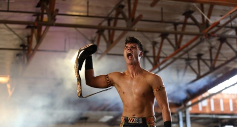 Within the confines of a wrestling ring, illuminated by spotlights, he transforms into Mathias: a sledgehammer-wielding, barbed-wire-bat-swinging villain who rules the ring as the reigning Heavyweight Champion.