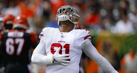 lessSan Francisco 49ers defensive end Arik Armstead (91) reacts after sacking Cincinnati Bengals quarterback Andy Dalton during the first half an NFL football game, Sunday, Sept. 15, 2019, in Cincinnati. (AP