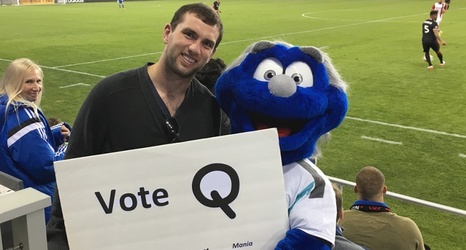 The Quakes mascot is through to the final of the MLS Mascot Mania Bracket. And Q, who is up against Orlando City’s Kingston, got some celebrity backing at Avaya Stadium on Saturday night in the shape of NFL superstar Andrew Luck.