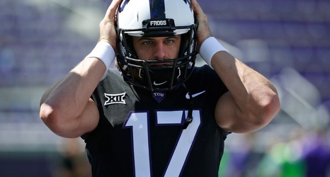 FILE - In this Oct. 7, 2017, file photo, TCU quarterback Grayson Muehlstein (17) warms up before TCU played West Virginia in an NCAA college football game in Fort Worth, Texas. Injury-plagued TCU, which has gotten three of its wins when scoring fewer than 20 points, likely will have fifth-year senior Muehlstein making his first career start in his final regular season game Saturday night against Oklahoma State, when the Horned Frogs have to win to get bowl eligible. (AP Photo/Ron Jenkins, File)