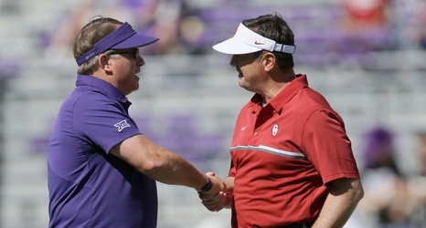 TCU head coach Gary Patterson, right, and Oklahoma head coach Bob Stoops shake hands on the field before an NCAA college football game, Saturday, Oct. 1, 2016, in Fort Worth, Texas. (AP Photo/LM Otero)