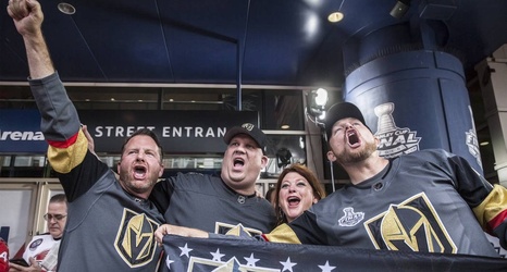 Golden Knights fan Tim Haughinberry, Frank Veilleux, and Mindy and Kevin Volcic cheer for Vegas outside Capital One Arena before the start of Game 3 of the NHL Stanley Cup Final with the Washington Capitals on Saturday, June 2, 2018, in Washington. Benjamin Hager Las Vegas Review-Journal @benjaminhphoto