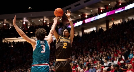 Wyoming's Naz Meyer shoots over New Mexico's Luke Haupt during their game Saturday night in Albuquerque, N.M.